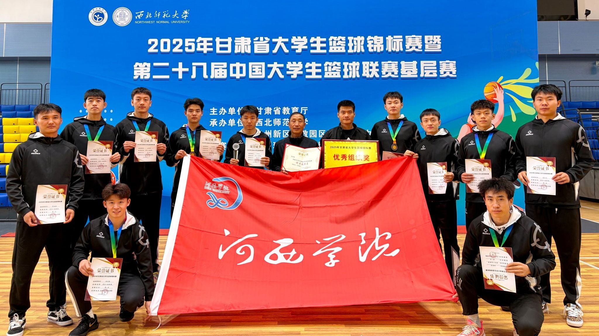 10月25日至31日,2025年甘肃省大学生篮球锦标赛在兰州举行,来自全省38所高校的660余名运动员参与角逐。我校组织男子甲组、乙组篮球队参赛,其中男子乙组篮球队在激烈的竞争中脱颖而出,最终斩获季军,同时荣获赛事优秀组织奖。