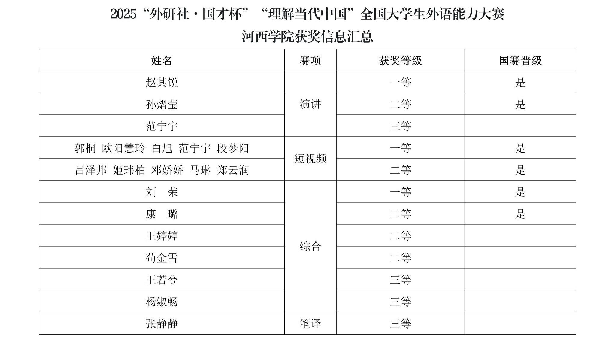 经过激烈角逐,共有46名选手凭借出色的表现晋级全国总决赛。河西学子共获得一等奖3项、二等奖5项及三等奖4项的优异成绩。其中,综合、演讲及短视频赛项共有6位选手(团队)成功晋级全国总决赛。同时学校荣获“优秀组织奖”。