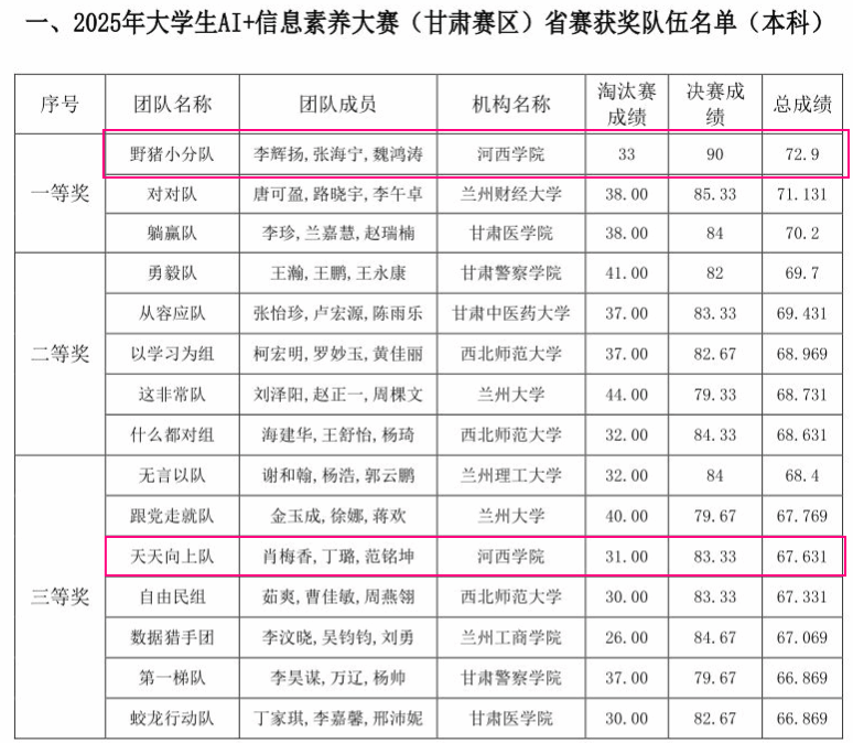 2025年大学生“AI+信息素养”大赛甘肃赛区决赛中,我校本科生代表队“野猪小分队”和“天天向上队”表现出色,分获一等奖和三等奖。其中,“野猪小分队”以总分第一名的优异成绩勇夺省赛冠军,成功晋级全国联赛。