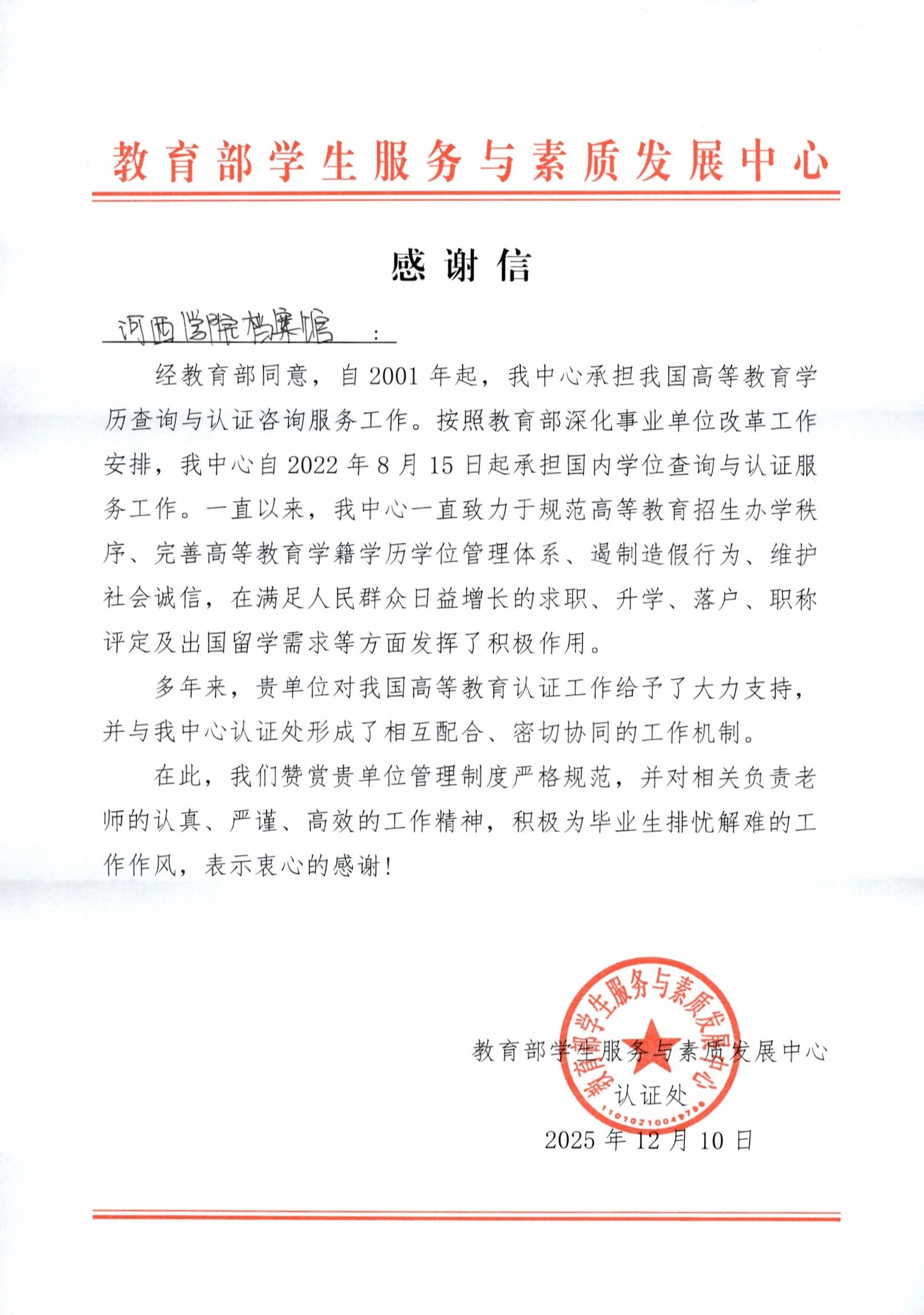 日前,学校收到教育部学生服务与素质发展中心发来的感谢信,对学校长期以来在高等教育学历认证工作中给予的大力支持表示感谢。这是学校自2023年以来,再次获得该中心致送的感谢信。信中提到:多年来,河西学院对我国高等教育学历认证工作给予了大力支持,并与教育部学生服务与素质发展中心认证处形成了密切的工作机制。在此,对学校档案管理制度严格规范表示赞赏,并对相关负责老师的认真、严谨、高效的工作精神、积极为毕业生排忧解难的工作作风表示衷心的感谢。...