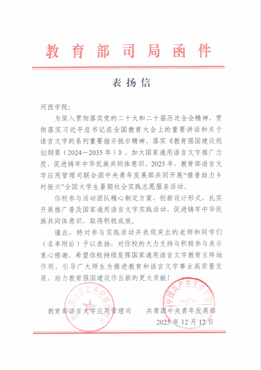 学校社会实践团队荣获2025年“推普助力乡村振兴”全国大学生暑期社会实践优秀团队
