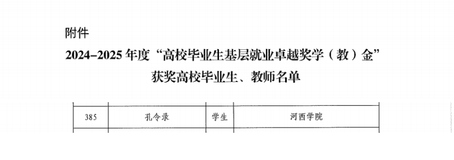 近日,2024-2025年度“高校毕业生基层就业卓越奖学(教)金”获奖名单正式公布,我校毕业生孔令录名列其中。此前,我校毕业生胡毓莹、教师陈刚及毕业生唐振宇已先后荣获2022-2023年度、2023-2024年度该奖项。至此,学校已连续三年在这项国家级就业领域表彰中荣登榜单,充分彰显了学校在引导毕业生扎根基层、服务国家战略方面的扎实育人成效与鲜明办学特色。