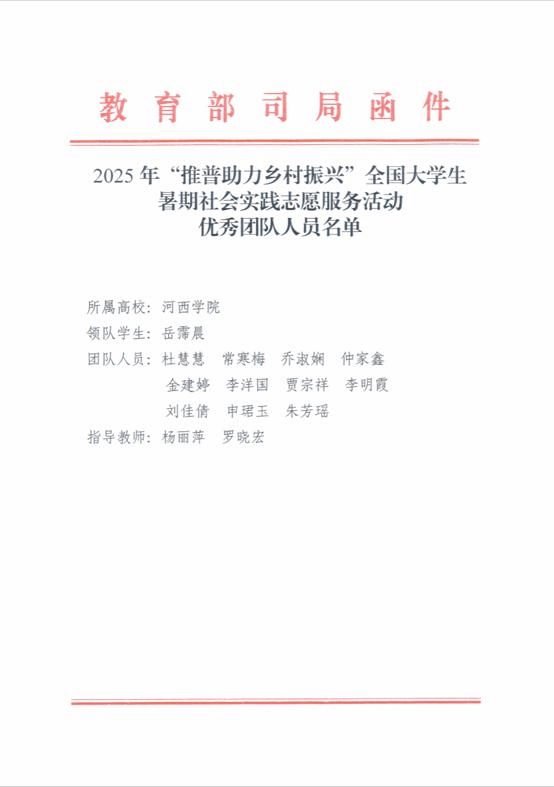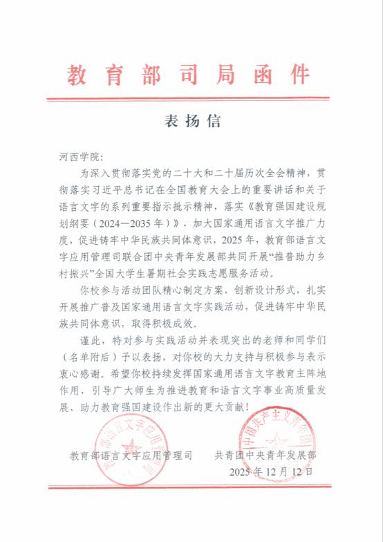 近日,学校外国语学院赴肃北蒙古族自治县”哈达连心·马鞍载语”推普助力乡村振兴社会实践服务团受到教育部语言文字应用管理司和共青团中央青年发展部联合表扬,获评2025年“推普助力乡村振兴”全国大学生暑期社会实践志愿服务活动优秀团队。