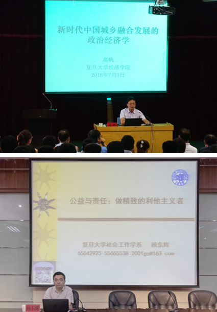 期间,复旦大学专家奉献了精彩的高水平学术报告。报告主题有“公益与慈善:做精致的利他主义者”、“新时代中国城乡融合发展的政治经济学”、“新时代的社会治理”、“社会工作在中国发展的意义与实践”、“情感治理模式的当代实践及其智慧应用”、“文化遗产核心价值的辨析与活用”、“旅游管理学科建设与人才培养的新机遇与新模式”和国家社科基金项目申报专场辅导报告等。
