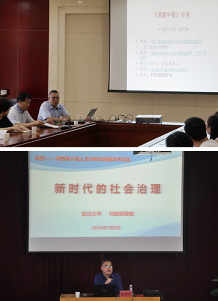 7月3日至4日,复旦-河西第六届人文与科学高端学术论坛在我校河西讲堂成功举办,复旦大学社会工作学系博士生导师、文科科研处处长、校教指委社会科学委员会副主任顾东辉教授,系主任赵芳教授,经济学院博士生导师高帆教授,文博系博士生导师杜晓帆教授,国际关系与公共事务学院博士生导师刘建军教授、唐亚林教授,旅游学系副系主任孙云龙副教授,文科科研处副处长葛宏波研究员,项目与规划办公室主任肖卫民副研究员等9位人文社科专家应邀莅临我校开展学术报告会、座谈交流会和调研考察等系列交流活动。