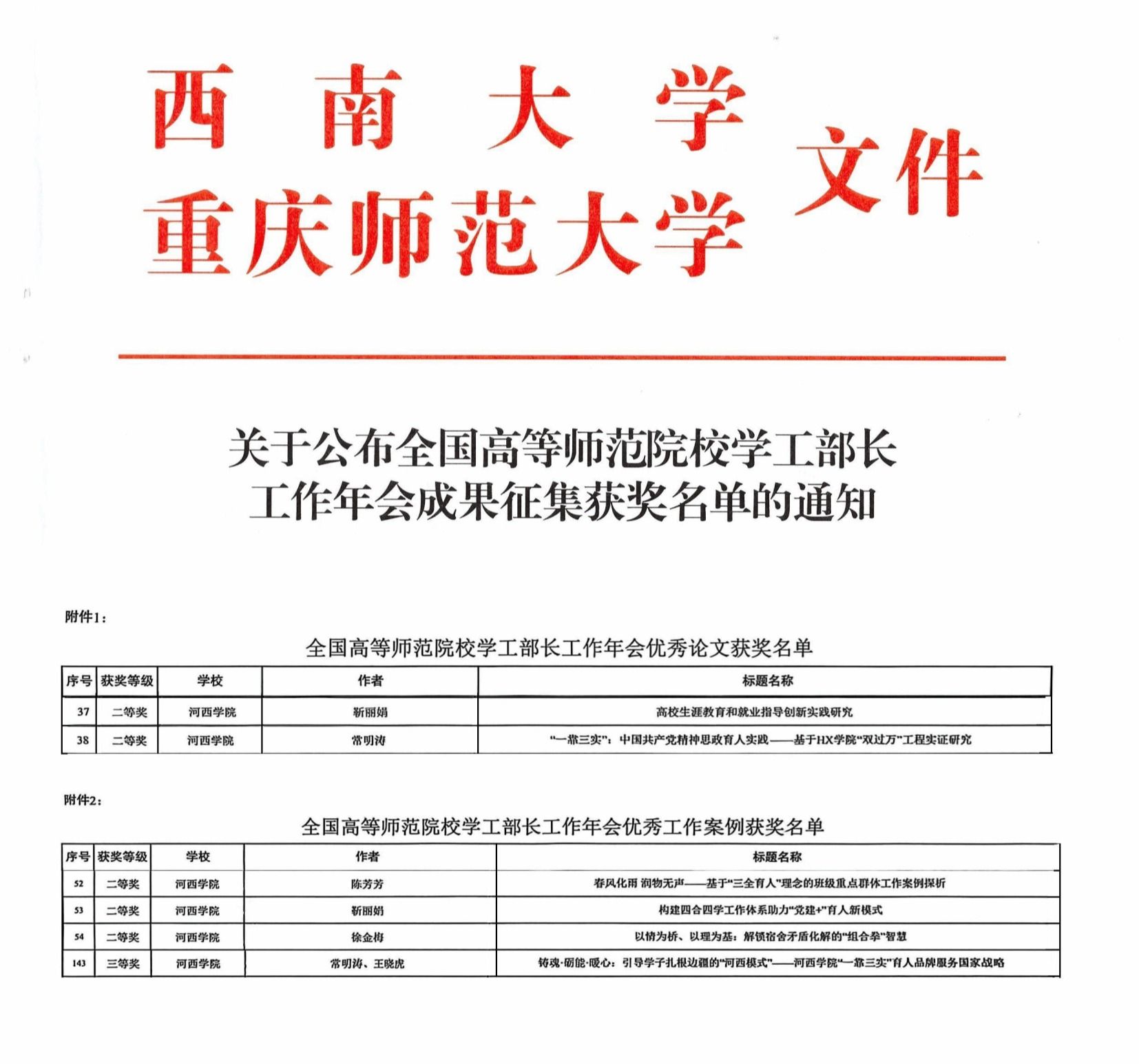 10月22—24日,全国高等师范院校学工部长工作年会在重庆师范大学召开。此次工作年会成果征集活动得到广泛响应,共收到论文210余篇、工作案例430余篇,集中展现了各高校在学生工作中的创新实践与理论探索。我校报送的工作案例和论文在年会成果征集中获奖,其中3个工作案例、2篇论文荣获二等奖,1个工作案例获三等奖。 此次会议由西南大学与重庆师范大学共同承办,北京师范大学、华东师范大学等46所高等师范院校200多位学工干部参加会议,...