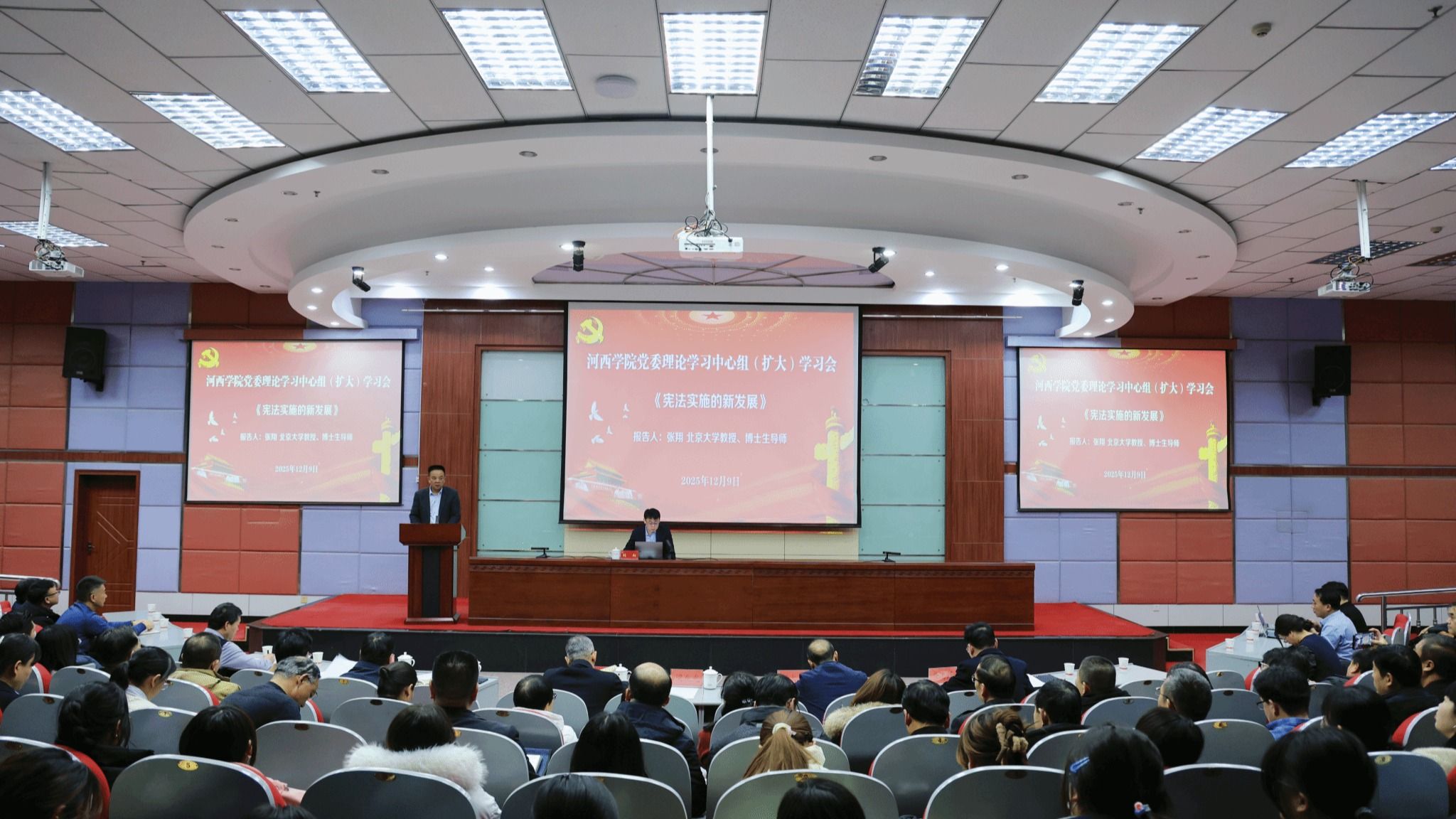 12月9日,学校召开党委理论学习中心组(扩大)学习会,传达学习习近平总书记对全面依法治国工作作出的重要指示和中央全面依法治国工作会议精神。党委书记梁兆光主持并讲话。北京大学法学院教授、宪法实施研究中心主任张翔作专题辅导。党委副书记高荣,党委常委、副校长唐志强作书面交流发言。张翔以“宪法实施的新发展”为题,立足习近平法治思想,紧扣时代需求与法治实践,系统梳理了宪法实施的理论脉络与实践进展;聚焦当前国家法治建设中的关键议题,...