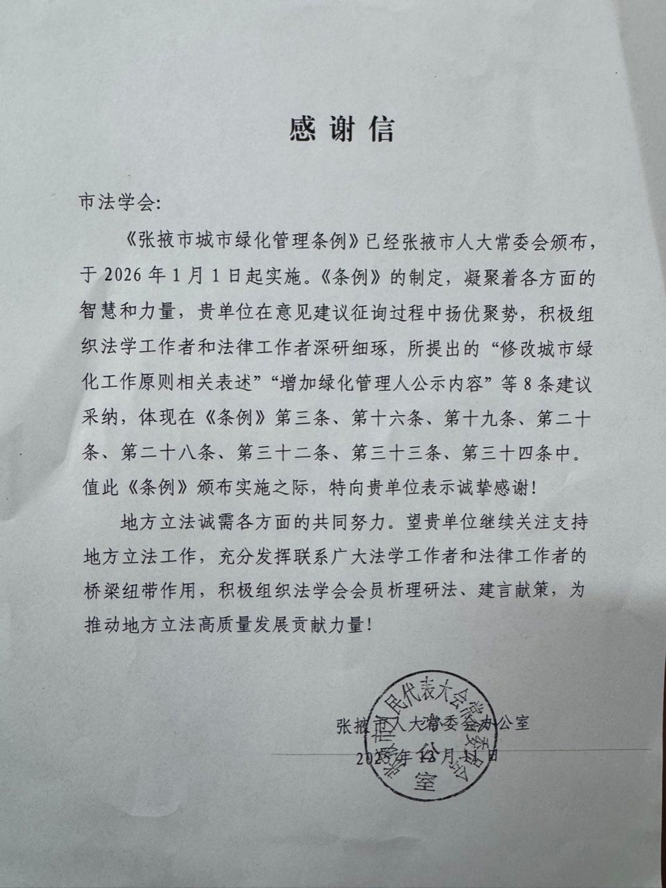 近日,张掖市法学会向法学院发来的感谢信,对法学院及于访勤副教授在《张掖市城市绿化管理条例(草案修改稿)》立法意见征集工作中的贡献表示感谢。 在张掖市法学会组织的《张掖市城市绿化管理条例(草案修改稿)》征求意见座谈会上,于访勤老师与其他六位法学专家立足张掖实际,围绕条例内容,从四个维度共提出32条建设性意见,其中8条被正式采纳。该条例已由张掖市人大常委会审议通过,将于2026年1月1日起施行。张掖市法学会在感谢信中充分肯定了法学院在服务地方法治建设中所发挥的桥梁与智库作用,...